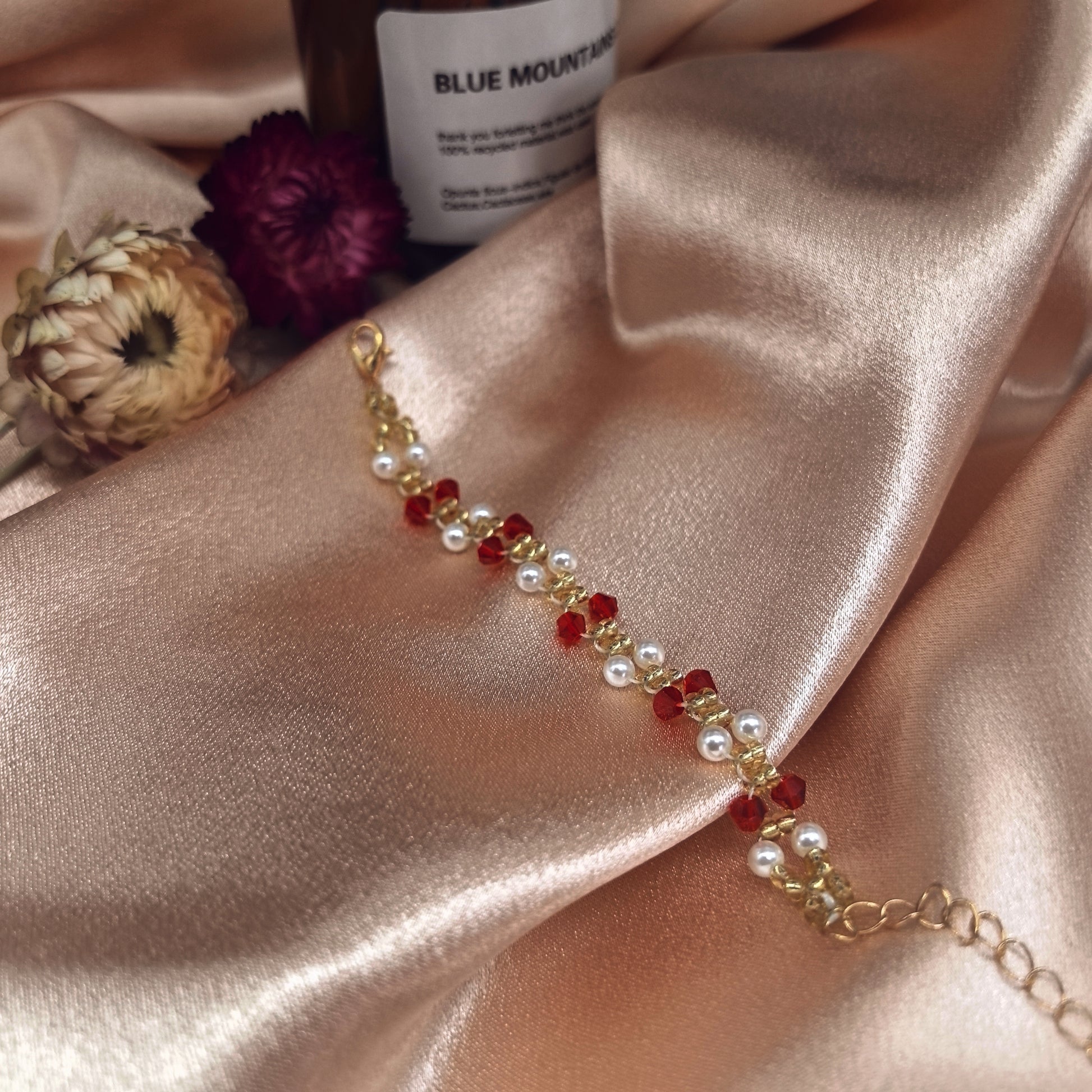 - Beads: The anklet features a combination of vibrant red crystals and lustrous white pearls, arranged in a geometric pattern that creates a visually appealing and harmonious look.