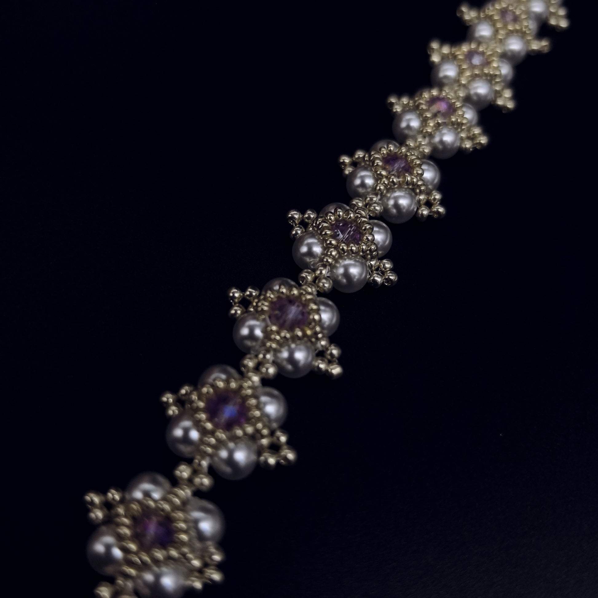 Floral Motif: The bracelet features intricate floral patterns made from lustrous pearls and shimmering amethyst gemstones.