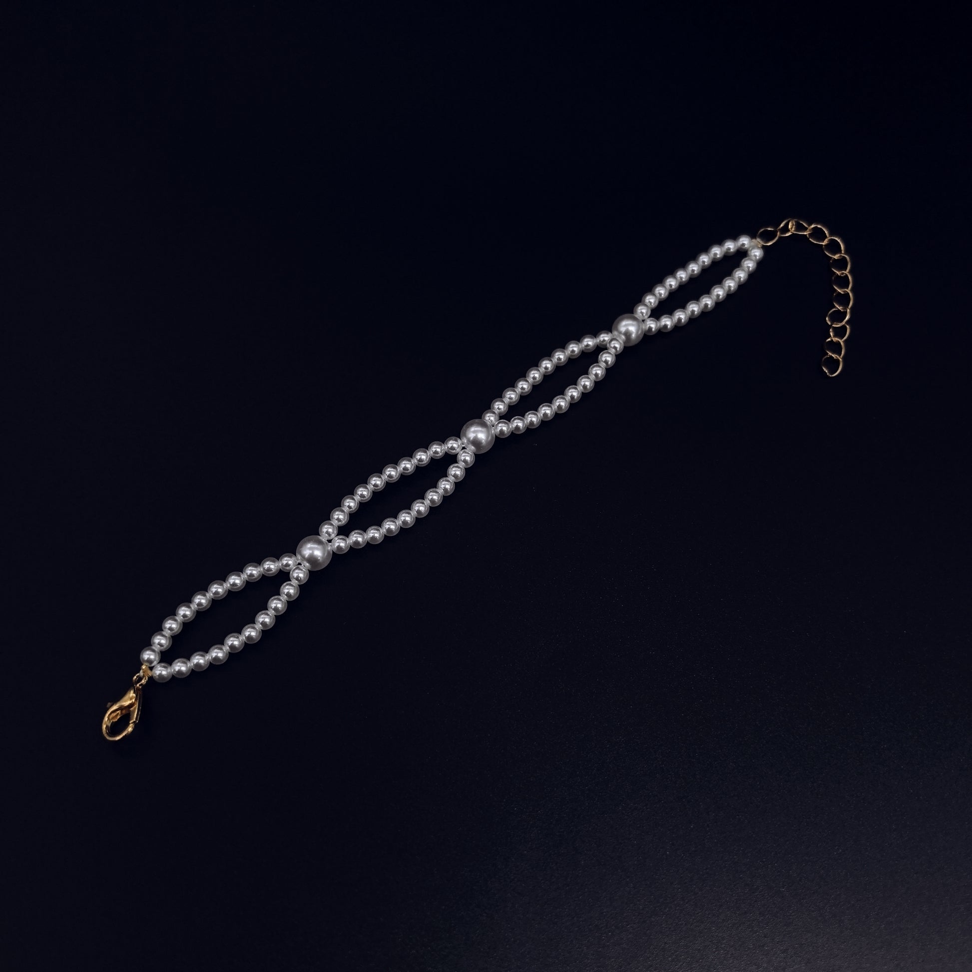 - Beads: The bracelet features a combination of small and large white faux pearls, arranged in a visually appealing pattern.